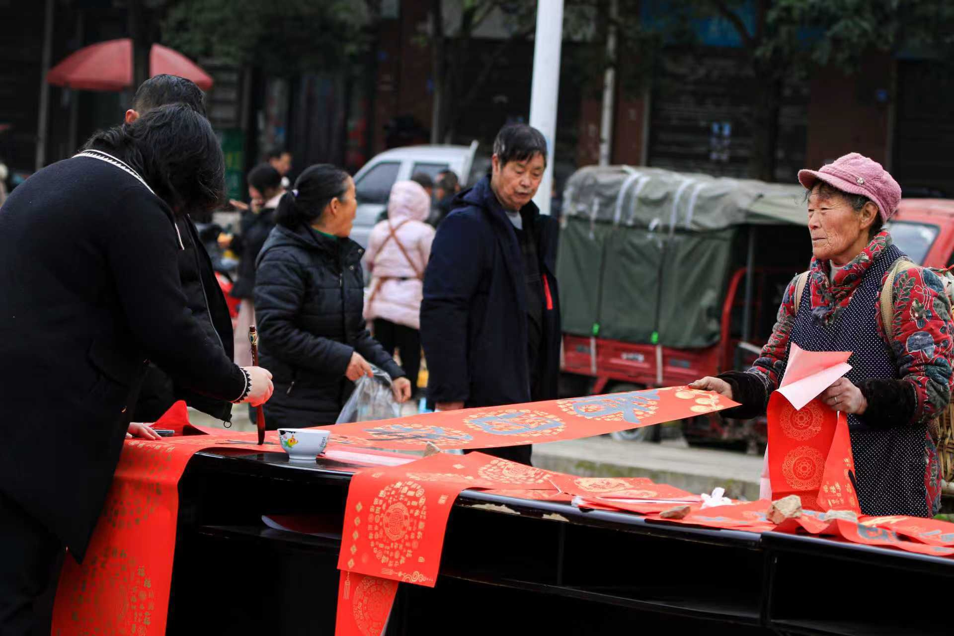 为满足群众的个性化需求,区书法家协会的老师们还开启了“点单式”书写服务,耐心询问居民的喜好与期盼,按需创作春联内容。社区居民们或围在桌旁主动拉纸、晾墨,静静等待心仪的春联;或驻足观摩学习,近距离领略书法艺术的独特魅力;或与书法老师畅谈春联的文化意蕴,分享自己对新春的美好憧憬。